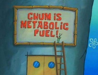 Plankton: (sauer) „Du sollst dir witzige Werbetexte einfallen lassen, damit der Pöbel da draußen weiterhin glücklich ist! (liest die Ideen vor, die auf Patricks Block stehen) 'Fraß spacht Maß'… Kann es sein, dass wir das schon irgendwann hatten?“