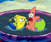 - (SpongeBob und Patrick üben in einem kleinen Planschbecken schwimmen. Larry sitzt auf seinem Hochsitz und sieht ihnen dabei zu.)