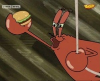 - (Mr. Krabs kommt – nackt, mit einem Krabbenburger und an einer Liane schwingend – aus der Küche geflogen.)