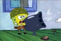 - (Mit einer Kanone feuert SpongeBob Klamotten auf Mr. Krabs. Mr. Krabs weicht den Sachen jedoch lachend aus.)