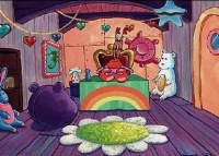 (Thaddäus, SpongeBob und Perla stehen vor der neu eingerichteten „Kuschel-Krabbe“.)