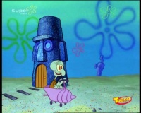 Thaddäus: (schiebt sein Haus in der Schubkarre zu ihm) „Tauschen! (rennt zu SpongeBob) So, das war’s! Ich hab dir alles gegeben, bis auf das Hemd, das ich am Leib trage!“