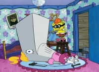- (SpongeBob schiebt einen Stuhl in Perlas Zimmer und stellt sich darauf, um besser an den Miespickel heranzukommen.)