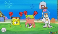 Sandy: „Wo ist es? Wo ist es? (findet das Paket vor SpongeBobs Haus) Aha, mein Paket mit Sportartikeln. Das muss vom Transporter gefallen sein, aber wo sind all die Sportgeräte? (hört den Lärm von den Wettkämpfen zwischen SpongeBob und Patrick) Was ist das denn? (sieht SpongeBob und Patrick beim Boxen mit ihren Beinen; sie geht auf sie zu) Hä? SpongeBob, was soll der Quatsch?“
