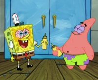 - (SpongeBob und Patrick bespritzen sich mit Senf und lachen. SpongeBob bespritzt Patrick.)