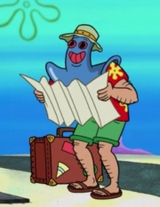 Thaddäus: ,,Das ist auch kein BH, das ist ein Brustgürtel. Meine Klamotten sind mir auch egal. Hauptsache ich bin weit weg von euch beiden. Und während ich weg bin... (bemerkt, dass SpongeBob und Patrick seine Klamotten tragen.) Während meiner Abwesenheit, wohnt ein zahlender Gast in meinem Haus. (Schreit) Belästigt ihn nicht!"