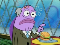 - (plötzlich quillt SpongeBob aus der Senfflasche, mit welcher der angesprochene Gast sich mehr Senf auf seinen Krabbenburger schmieren wollte, hervor und nennt seinen Namen.)