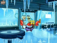 - (Plankton läuft auf dem Drehknopf des Thermostats und stellt es auf 136°F. Das Eis wird zu Wasser und Mr. Krabs geht baden. Dann rennt Plankton wieder in die andere Richtung (auf -26°F) und das Wasser, samt Mr. Krabs, friert wieder ein.)