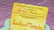 - Thaddäus: „‚Sie sind hiermit herzlich zu den kolossalsten und kultverdächtigsten Kunstereignis der Saison eingeladen: der Eröffnung der Galerie Diphterie.‘ Davon hab ich schon gehört. ‚Bikini Bottoms exklusivstes Präsentationsforum für Kunst. Diese Einladung gilt als Eintrittskarte für Thaddäus Tentakel … (liest noch mal) Thaddäus Tentakel … plus oins?‘“