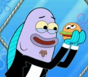Frederick T. Tinnef hat eine lilafarbene Haut und blaue Flossen. Er trägt einen schwarzen Anzug mit einem weißen Hemd und einer roten Fliege. | Frederick T. Tinnef hat eine lilafarbene Haut und blaue Flossen. Er trägt einen schwarzen Anzug mit einem weißen Hemd und einer roten Fliege. | ||