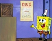 - (Mr. Krabs zieht das Handtuch von Thaddäus Rücken und schreit auf. Auch beim Ausdrücken der Pickel schreit er herum. Die Kunden verlassen deshalb angeekelt das Restaurant. Danach tritt ein Mann mit großer Brille und großer OWS-Kappe durch die Tür.)