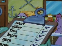 Mrs. Puff: (schaut auf ihr Klemmbrett) „Also, mal sehen, unsere heutige Aufsichtsperson ist, ähm … (leiser) Bart, Jimmy, nein, nein. Tina, Ralph, he! (panisch) SpongeBob!“
