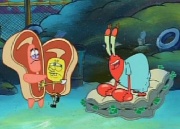 Mr. Krabs: (verkniffen) „Nein, ich bin nur von Schmerzen überwältigt und halte die Tränen in meinen Augen zurück, weil das ein neuer Modetanz ist!“ (bewegt die Arme)