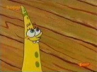 - SpongeBob: „Mit leerem Magen kann ich nun mal nicht schreiben. Ich brauche meine Gehirnnahrung.„ (macht den Kühlschrank auf) „Also, mal sehen. Weiß- oder Graubrot, oder Vollkornbrot? Hängt ganz davon ab, ob ich Wurst drauf lege, oder Käse.“ (es klingelt) „Ich fass’ es nicht. Besuch für mich.“ (macht die Tür auf und der Postbote steht vor seinem Haus) „Hallöchen!“